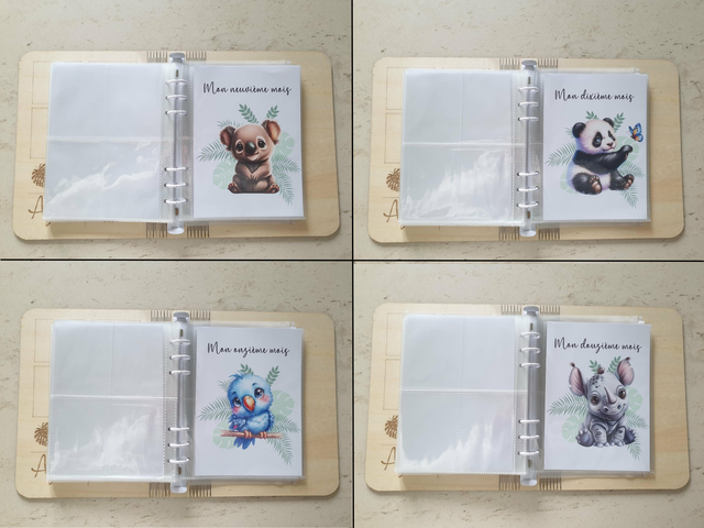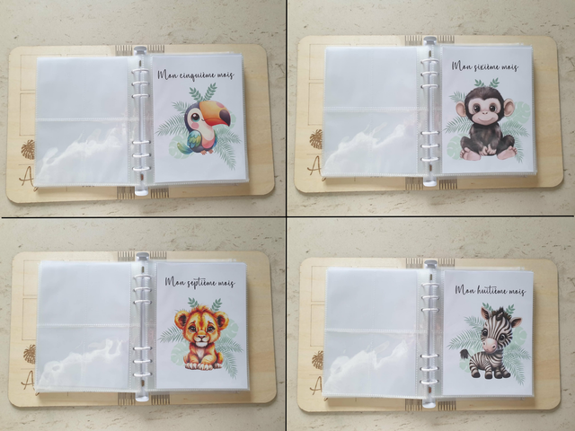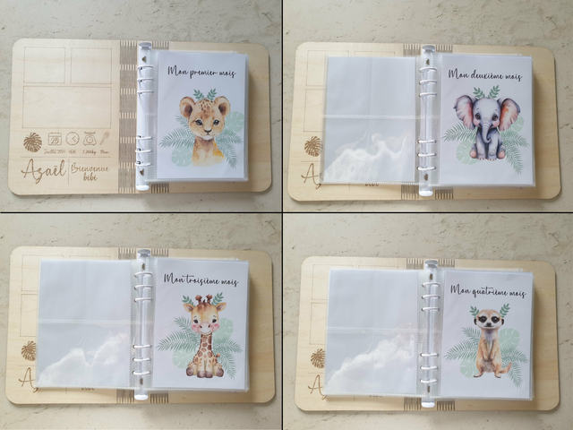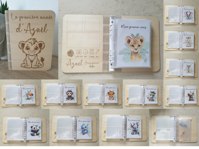 Un album photo gravé sur bois pour conserver les plus beaux souvenirs de la première année de bébé.